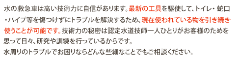 天王寺区でのトイレつまりや水漏れ問題は『水の救急車天王寺区店』にお任せください。阿倍野ハルカスのようにそびえ立つサービス品質で、365日、迅速に対応します。お客様が安心できる透明な料金と丁寧な説明を心がけています。